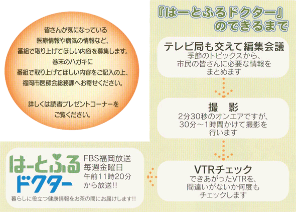 平成20年11月からFBS福岡放送にて『 はーとふるドクター』というテレビ番組をスタ ートしました。 第1回の放送は救急医療、第2回はインフル エンザという風に、毎回季節のトピックスや注 目の話題について、専門家であるドクターが分 かりやすく説明します。 テレビというメディアを使って、市民の皆さ んの健康や医療についてこれまで以上に広く積 極的な情報提供を行っていきます。