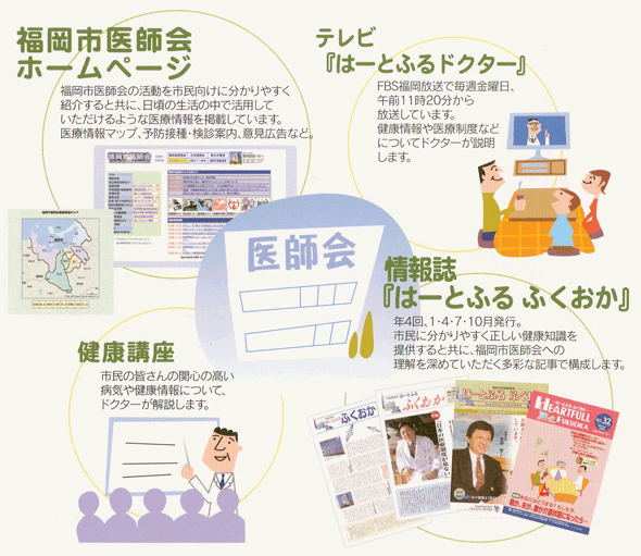 福岡市医師会は、市民の皆さんが健やかに生活していけるように、さまざまな活 動を行っています。その中で広報は、けがや病気を防止するための健康情報や、医 療制度や保険に関する情報、また福岡市医師会の取り組みなどを市民の皆さんに向 けて発信しています。